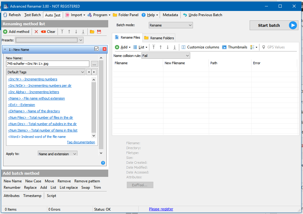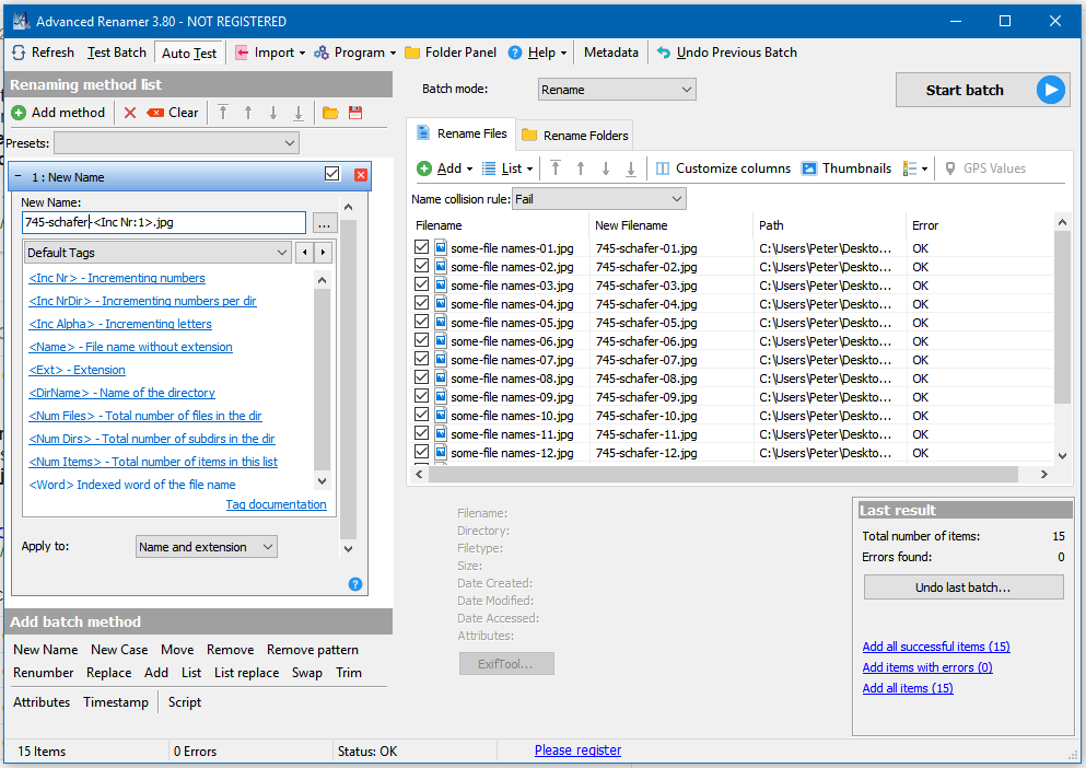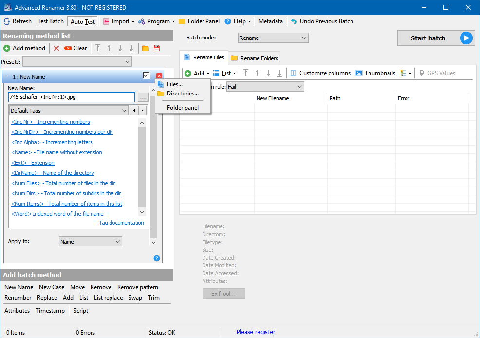 Then, from the “Default Tags” section, select “ <Inc Nr>- Incrementing numbers” which will auto-insert this tag into the “New Name” Field.