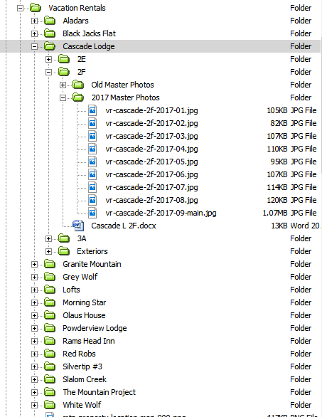 We have implemented a new central directory file structure to organize our real estate, long term and vacation rental property listing content. All new property content (photos, text, information) is stored in the MTP Property Library in a unique folder for that property. This allows us, in the future, to easily access and manage the content for any of our properties. For example, in the image below, you see the structure of our vacation rental property listings.