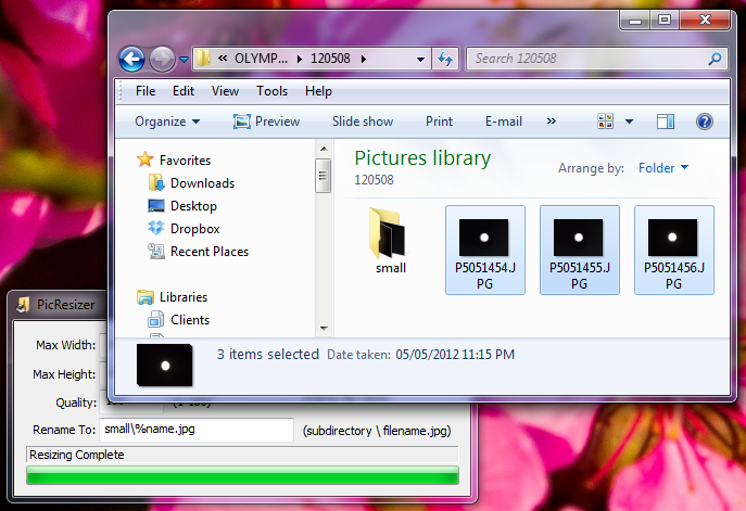 Once the desired files are selected, drag and drop the selected files directly onto the PicResizer application window. The utility automatically resizes the chosen images and places them in the created sub-directory called “small”. That’s it, finished!