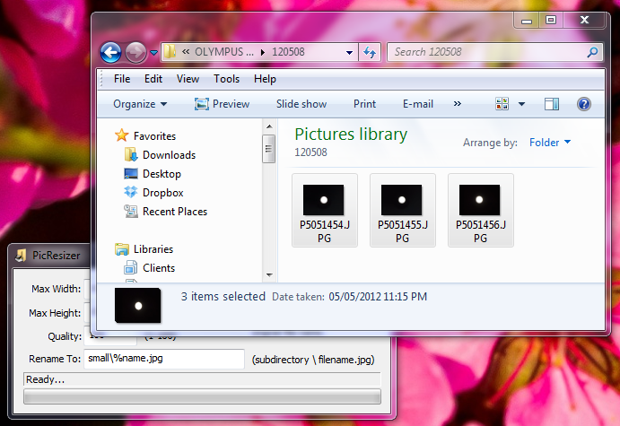 Once you have the utility configured, leave the PicResizer window open on your desktop, open your working directory of original photos that you wish to convert, select the images that you would like resized as in the next image.